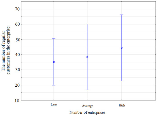 Analysis of the sales of renewable fuel briquettes to selected customers did not show a significant effect of the studied factor on the number of enterprises established. The analysis showed a significance level of p = 0.759, for an F(2, 13) empirical statistic value of 0.28230. The analysis conducted (using ANOVA) showed that the number of regular customers had no effect on the number of enterprises. Figure 6 shows the characteristics of the relationship between the number of enterprises and the number of regular customers of an enterprise.
