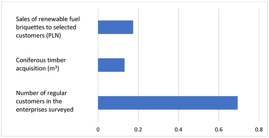 The factors presented in Table 4 are the number of enterprises—production of other wood products, acquisition of coniferous wood [in m3], sale of briquettes from renewable fuels to selected recipients, small and medium-sized companies [in PLN]—and the number of regular customers in the surveyed enterprises—average. The number of customers [in items] has a significant impact on the development of forest biomass production. These are economic factors that show the essence of the functioning of the forest biomass market.