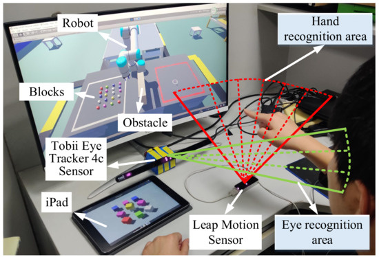 The size of the monitor used was 27 inches. During the experiment, the user faced 70 ± 10 cm in front of the screen, and the eye level was close to the middle of the screen. As each participant’s eyes are different, such as their inter-pupillary distance, Tobii was calibrated in advance for each user according to the manufacturer’s instructions. Leap was placed 30 ± 5 cm forward from the outside of the shoulder of the user, which is a comfortable position and did not block the Tobii equipment.