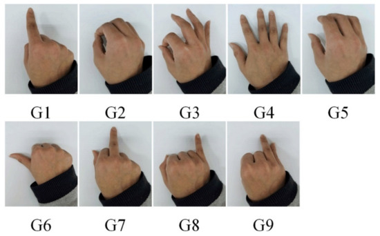 Based on previous research [34,35], the following sections list a set of typical gestures. Figure 4 shows the finger joint changes with time. In an actual process, only gestures G1–G4 are needed. The robot does not need to respond to other gestures, but considering the expansion of the function in the future, we expanded them to G1–G9. The joint angle of each gesture is maintained for 30 s, as shown in Figure 5A.