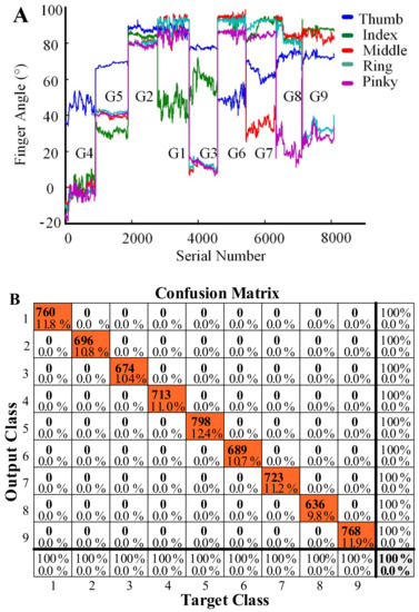 Gesture recognition [36] can be based in neural networks with two hidden layers, a Tansig activation function, and softmax classification. It can be seen that the eigenvalues of these nine kinds of algorithms are very obvious, and can recognize each gesture with 100% accuracy (Figure 5B).