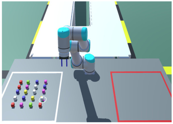 Building blocks reflect three major elements of a primary assembly process: acquisition, manipulation, and operation [35]. In many places, building blocks are used to describe assembly behavior. Syberfeldt [48] used building blocks in VR human–computer interaction (HCI) research. This study explored HRC by simulating the process of constructing 10 building blocks (30 mm × 30 mm × 30 mm) in cooperation with the robot of 6-DOF. The algorithm for controlling the movement of the robot gripper by hand can be seen in our previous work [49]. A model layout of the experimental scene is shown in Figure 8.