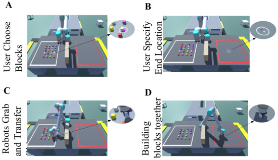 The purpose of this experiment was to determine the differences in efficiency and operation of a traditional controller method and the proposed method when controlling the robot to grasp, move, and place blocks by teleoperation in a virtual environment. The experimental environment of the participants was the same as that shown in Figure 2.