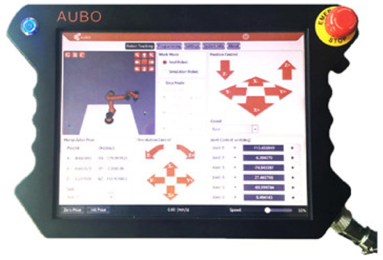 The representative non-contact operation robot was operated through the teaching device (Figure 11). Generally, the teaching device had a touchscreen, and the movement and rotation of the robot were controlled separately. We used buttons to simulate the teaching device and control the degrees of freedom of the robot. For group, A, the user control model was replaced by a conventional robot control mode, which had six buttons (Q, W, E, R, T, Y) for controlling movements with three degrees of freedom, another six buttons (A, S, D, F, G, H) for controlling rotation with three degrees of freedom, and two more buttons (Z, X) for controlling the loosening and relaxing of the end effector. The other experimental conditions were the same as for group B.