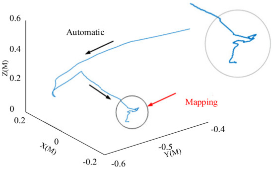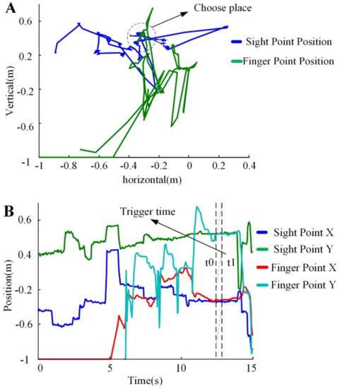 The eye–hand indication trajectory result is shown in Figure 12. The green curve represents the intersection of the direction of the finger and the screen, while the blue curve represents the eye’s intersection. Figure 12A shows the trajectory position on the screen, while Figure 12B shows the relationship between the trajectory and time. The selection trigger was generated at t1, which is consistent with the user’s intent choice. Figure 13 is the trajectory of the robot’s end movement.
