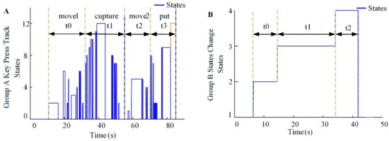 According to the experimental process, there were 14 states in Group A (button states 1–6 = up, down, left, right, forward, and back. States 7–12 = +Roll, −Roll, +Pitch, −Pitch, +Yaw, and −Yaw. States 13–14 = Grab, Release) and four states in Group B (eye–hand states 1–4 = Recognize, Indication, Capture, and Mapping). Recording changes in the state with the time can be used to compare the performance of the experimental methods. The user participation process is presented in Figure 14. In Group A, the stage where the arm grasped and moved near to the objects took t0. The stage of grabbing the object took t1. The moving stage took t2, and the assembly stage took t3. Group B had one less stage than Group A, but the quality of the assembly should be considered in terms of the time and labor expended by users. In Group B, the stage of selecting the object and indicating the target position took t0. In the grabbing stage, the robot took t1 to capture the object and move it. Mapping assembly took t2.