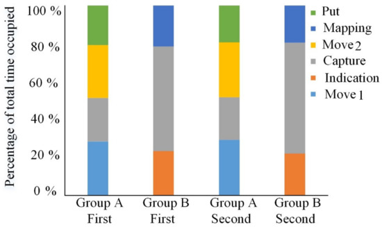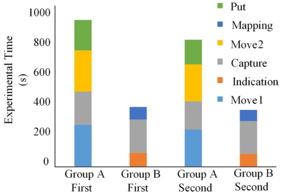 The time consumed in the experiment was the main consideration, but the percentage of time consumed in each stage of the experiment is also worth discussing. The percentage of time is mainly used to analyze the internal composition of the experimental model. It can be seen from Figure 15 that Group A completed the experiment the first time in an average of 15.2 min, while Group B took 6.2 min. For the second time, Group A completed the experiment in an average of 13.5 min, while Group B took 5.9 min. Both times, Group A was slower than Group B. Figure 16 shows that in Group A, for the first time, 28.4% of the time was used to move the robot to the object. Grabbing objects took 22.9%, moving objects to the target position took 27.9%, and the assembly operation took 20.8%. The second time, moving the robot to the object took 29.3% of the time, grabbing objects took 22.4%, moving objects to the target position took 29.0%, and the assembly operation stage took 19.3%. For the first time for Group B, indicating the object and end position took 23.2% of the time, 55.3% was occupied by capture, moving the object to the target position, and mapping assembly of the object took 21.5%. The second time, indicating the object and end position occupied 22.0% of the time, 58.5% of the time was occupied by the capture stage, and the mapping assembly stage took 19.4%. For grasping and moving, handing objects to the robot arm significantly reduced the overall cooperative assembly time. The importance of moving the object to the target position was weakened.