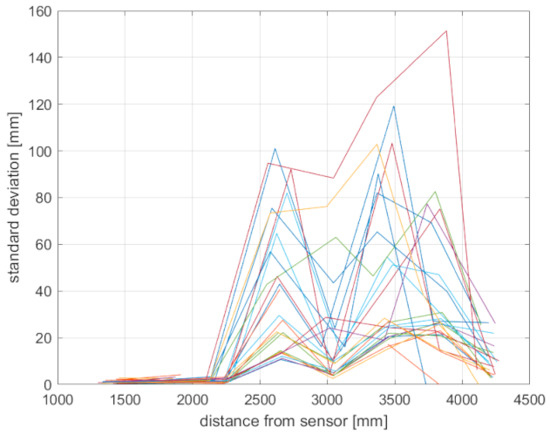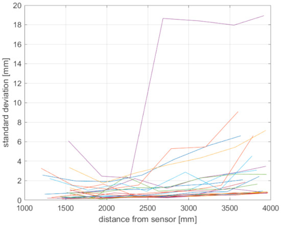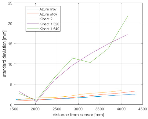 The precision of the examined sensors is in Figure 4 in the form of standard deviation. As can be seen, the standard deviation of Kinect v1 considerably grows with distance in both available modes; furthermore, it is the least predictable. This is caused by the sensing technology implemented in Kinect v1, where noise varies for points even in the same distance; Kinect 2 and the Azure Kinect noise have the same character, but the latter has slightly higher precision.