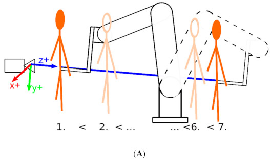 (A) Plastic figurine moved along the Z axis of the examined sensor. (B) Picture of the actual laboratory experiment. (C) Example of detected and undetected body joints.