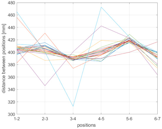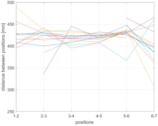 In Table 3, joint distances between individual positions where the expected result is 400 mm are shown. For each sensor and the respective mode, there are three rows. The first row is the average distance change of all joints; the second row is the minimal average distance change of a joint (the one with the lowest value); and the third row is the maximal average distance change of a joint (the one with the highest value). As can be seen, the Azure Kinect values are closest to 400 mm; Kinect v2 has similar values, but the maximal values are considerably higher compared to the Azure.