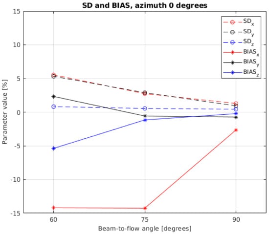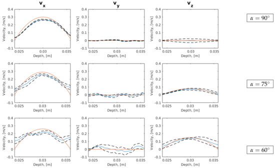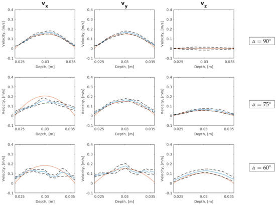 Figure 6, again calculated from the entire center plane. One can see that the RSD is (1.15%, 1.10%, 0.39%) for 90 degrees beam-to-flow angle, the RB is (9.81%, 3.16%, 4.45%). The RSD for 75 degrees beam-to-flow angle (2.36%, 3.07%, 0.49%) and the RB is (−13.23%, −1.54%, 6.08%). The RSD for 60 degrees beam-to-flow angle is (4.67%, 4.99%, 0.96%) and the RB is (−9.78%, 1.82%, 14.65%). It is visible that the RSD is the same for cases without a rotation angle and for cases with 45 degrees rotation angle as stated above, but the RB shows larger variations.