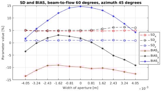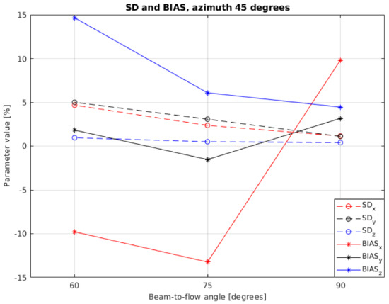 component. RB is also growing and varies from −0.57% to −14.25%. In the case with a 60 degrees beam-to-flow angle all parameters are increasing again. The RSD is (5.53%, 5.31%, 0.82%) for (