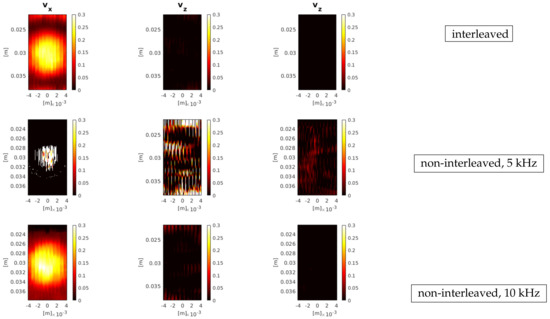 Cross planes for each velocity component are shown for all three sequences, which were mentioned above. The top line shows cross planes for the interleaved sequence with
