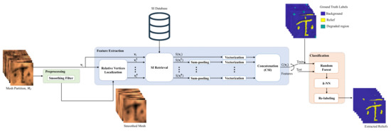 More recently, support vector machine (SVM) was applied to extract relief region from the surface of stone monument [24]. The modified curvature-based method [18] was initially used to identify relief candidate segments from mesh partitions. The relief candidates include actual reliefs and relief-like noise. From each candidate segment, 79-dimensional geometrical features were extracted, which consist of the appearance, quadratic approximation for cross section, and local extrema of the candidate segments. The geometrical information was learned by the SVM to determine whether the candidate is relief or not. While this machine learning method outperformed the height estimation [8] and curvature-based methods [7,18], the superior performance of the SVM-based method [24] is largely dependent on the local surface features that were identified on the 3D mesh and the conditions for the removal of degraded region.
