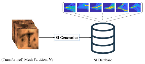 We present the proposed approach of extracting relief regions from the stone monuments in this section. A simple block diagram of the proposed relief extraction method is shown in Figure 2. Mesh partitions that contain identifiable characters are cropped from the 3D mesh. For very uneven steles, the cropped mesh partition can be slanted. To correct this, principal components of vertices of the mesh partition are obtained using the principal component analysis. The mesh partition is transformed to make the eigenvector corresponding to the smallest eigenvalue point vertically upward. The transformed mesh partition is denoted by M . The generation of SI involves the creation of SI for every vertex of all the 3D mesh partitions, and the information is stored offline in an SI database (Figure 3). For a reference vertex v i , four relative surface points, v i 1 , v i 2 , v i 3 , and v i 4 , are searched along the bi-directions of the two principal curvatures. The five SI representation, S ( v i 1 ) , S ( v i 2 ) , S ( v i 3 ) , S ( v i 4 ) , and S ( v i ) , are easily queried offline from the SI database.