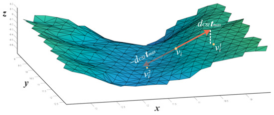 Figure 4. Relative vertices localization. For v i , a 3D point located at a distance of d C S I in t m a x direction is identified. The 3D point is projected on the mesh and the closest vertex is obtained as the relative vertex v i 1 . Similarly, v i 2 is identified using the opposite direction of t m a x .