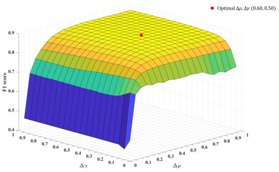 Consequently, other parameter combinations near Δ ρ = 0.6 and Δ γ = 0.5 does not reduce the performance much. This SI parameter combination that yielded the highest F1 score of 0.8730 is the optimal.