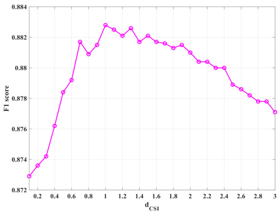 Figure 9. Performance of RF models (in terms of F1 score) for various d C S I values.