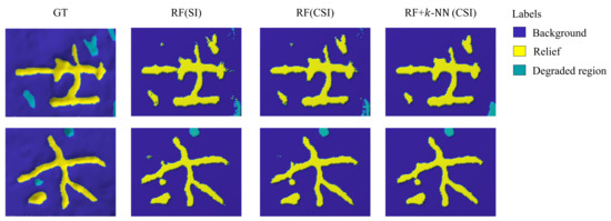 The machine learning-based methods using SVM and RF are both promising and they outperformed all other methods by eliminating degraded regions (see Figure 13f,g). However, the SVM-based method misclassifies many thin and small degraded regions as reliefs, which hinders recognition of the characters. The proposed method yielded more pleasant results by suppressing those thin degraded regions and producing reliefs with smooth boundaries.