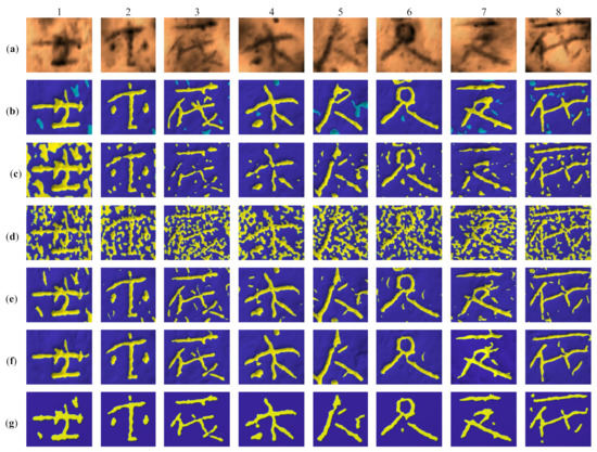 Figure 15 depicts the objective comparison of these methods in terms of accuracy, precision, recall, F1 score, and segmented inscription recognition index (SIRI) [35]. The SIRI can evaluate the inscriptions extracted from the 3D scanning data by imitating human subjective inscription recognition. If a region slightly thinner or thicker than the actual relief segment is detected, it has little effect on the perceived quality of the inscription. In contrast, unexpected misdetection makes the perceived quality degrade significantly. Based on these observations, SIRI evaluates the quality of extracted inscriptions with different importance with respect to region.