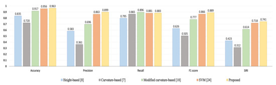 Figure 15. Performance evaluation of the relief extraction methods in terms of precision, accuracy, recall, F1 score, and SIRI.