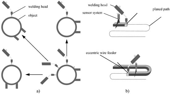 - Schmitz, M.; Weidemann, C.; Corves, B.; Hüsing, M. Trajectory Planning Strategy for Multidirectional Wire-Arc Additive Manufacturing. In ROMANSY 23—Robot Design, Dynamics and Control; Springer: Berlin/Heidelberg, Germany, 2020; pp. 467–475. [Google Scholar] [CrossRef]