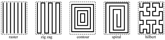 - Bertoldi, M.; Yardimci, M.; Pistor, C.; Guceri, S. Domain decomposition and space filling curves in toolpath planning and generation. In 1998 International Solid Freeform Fabrication Symposium; The University of Texas in Austin: Austin, TX, USA, 1998. [Google Scholar]