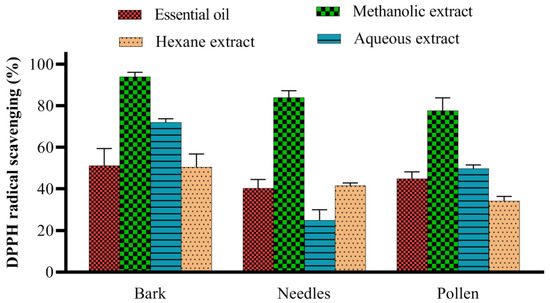DPPH radical scavenging (%) of the four different extracts (hexane, methanolic, aqueous extracts, and essential oils (each 1 mg/mL)) prepared from the Pinus eldarica bark, needles, and pollen. Data are expressed as mean ± standard deviation (SD), representative of three independent experiments.