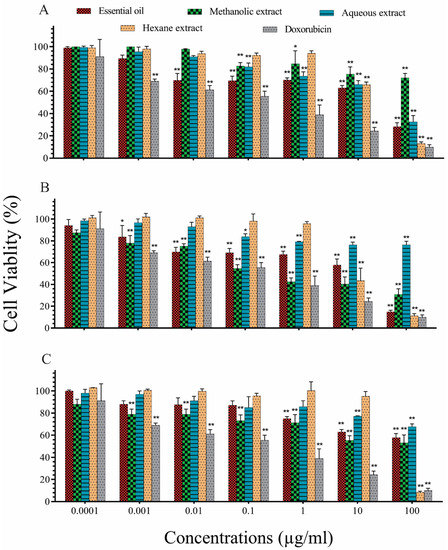 Cytotoxic activity of the four different fractions (hexane, methanolic, aqueous extracts, and essential oils) prepared from Pinus eldarica (A: Bark, B: Needles, and C: Pollen) against the A549 cell line after 48 h of treatment with various concentrations of essential oil, and methanolic, aqueous, and hexane extracts. Data are expressed as mean ± standard deviation (SD), representative of three independent experiments. * p < 0.05 and ** p < 0.01 vs. control.