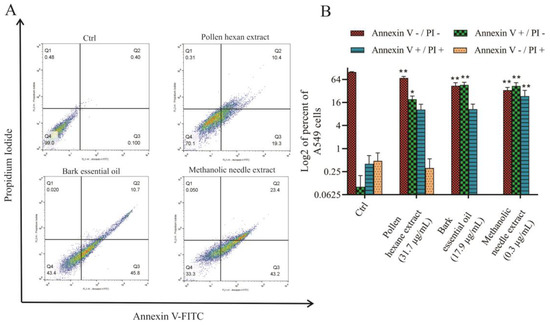 (A) Annexin V/propidium iodide (PI) staining was used to identify viable cells: Q4 (Annexin V−, PI−), early apoptotic cells: Q3 (Annexin V+, PI−), late apoptotic: Q2 (Annexin V+, PI+), and necrotic cells: Q1 (Annexin V−, PI+). The apoptotic effects of extracts and essential oil were determined by flow cytometry after 48 h in A549 cells, with untreated cells used as a control and cells treated with IC50 concentrations of pollen hexane extract, bark essential oil, and methanolic needle extract; (B) Quantitative results of apoptotic effects evaluated by the Annexin V/FITC assay. Data are expressed as mean ± standard deviation (SD), representative of three independent experiments. * p < 0.05 and ** p < 0.01 vs. control.