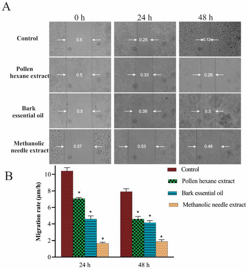 (A) Inhibition of A549 cell migration by Pinus eldarica extracts after 0, 24, and 48 h of treatment with bark essential oil (17.9 µg/mL), pollen hexane extract (31.7 µg/mL), and methanolic needle extract (0.3 µg/mL). The distance between the two edges of the wound is shown in millimeters; (B) Migration rate (µm/h) of three extracts. Data are expressed as mean ± standard deviation (SD), representative of three independent experiments. * p < 0.05 vs. control.