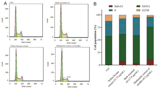 (A) Analysis of the cell cycle by flow cytometry in A549 cells after 48 h of treatment with bark essential oil (17.9 µg/mL), pollen hexane extract (31.7 µg/mL), and methanolic needle extract (0.3 µg/mL); (B) Cell cycle quantitative results.