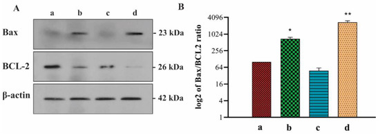 (A) Descriptive images of western blot analysis of Bax and Bcl-2 expression relative to β-actin as an internal control; (B) Bax/Bcl-2 ratio in A549 cell line treated with IC50 concentrations of P. eldarica extracts and essential oil for 48 h. a. Control group, b. Pollen hexane extract-treated group (31.7 µg/mL), c. Bark essential oil-treated group (17.9 µg/mL), d. Methanolic needle extract-treated group (0.3 µg/mL). Data are expressed as mean ± standard deviation (SD), representative of three independent experiments. * p < 0.05 and ** p < 0.01 vs. control.