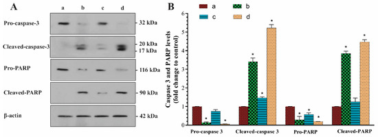 (A) Descriptive images of Western blot analysis of caspase-3 and PARP proteins; (B) Caspase-3 and PARP protein levels (fold change to control) in A549 cells treated with IC50 concentration of Pinus eldarica extracts and essential oil for 48 h. a. Control group, b. pollen hexane extract-treated group (31.7 µg/mL), c. bark essential oil-treated group (17.9 µg/mL), and d. methanolic needle extract-treated group (0.3 µg/mL). PARP, poly (ADP) ribose polymerase. Data are expressed as mean ± standard deviation (SD), representative of three independent experiments. * p < 0.05 vs. control.