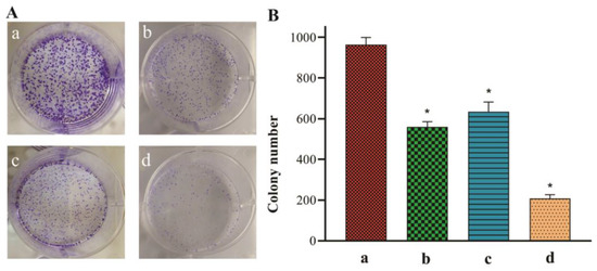 (A) Representative images of colony formation test in A549 cells with IC50 concentrations of P. eldarica extracts and essential oil for 14 days; (B) Mean value of colony numbers showing inhibition in treated groups. a. Control group, b. pollen hexane extract-treated group (31.7 µg/mL), c. bark essential oil-treated group (17.9 µg/mL), and d. methanolic needle extract-treated group (0.3 µg/mL). Data are expressed as mean ± standard deviation (SD), representative of three independent experiments. * p < 0.01 vs. control.