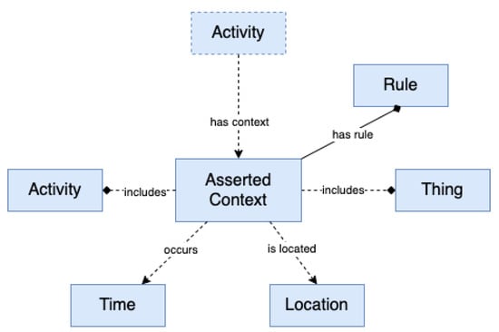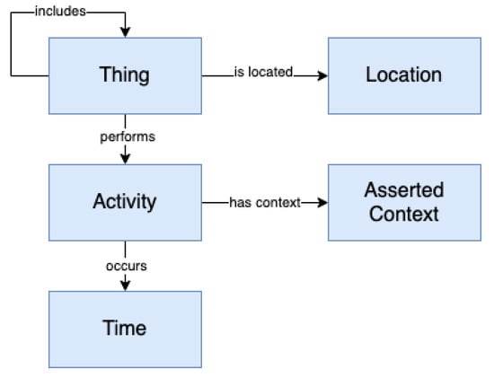 Context modeling has always been at the center of CA computing. Early approaches included key-value and markup schemes (e.g., XML), which are computationally efficient and easy to manage but support limited reasoning and fail to represent more complex relations among contextual entities. In order to achieve efficient representation of relations, graphical models were introduced, such as the context modeling language (CML) []. Object-based models are also exploited to integrate inheritance and encapsulation, influenced by the success of object-based programming. In past years, logic formalism, in the form of formal ontologies, was used as the preferred method for developing context models []. The emerging concept of the semantic web of things [] combines human, machine, physical and abstract things and environments toward a convergence of IoT with the semantic web. Hybrid approaches were introduced as early as 2004, when [] combined formal ontologies with CML. Reviewing the field, Perera et al. [] claim that incorporating multiple modeling techniques is the best way to mitigate each other’s weaknesses.