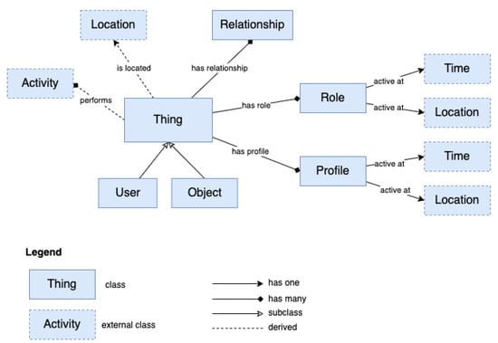 At the core of the proposed context model lies the thing—the abstract building block of the IoT. It is associated with the who feature. Things can be users, devices or other objects, and they are defined by a list of properties that are usually profiled data. There are two main observations that need to be captured by the context model: the state of each thing and the interactions among them. In essence, both types of observations can be combined into one, introducing the axiom that “Each observation includes one or more entities in a temporal and spatial extent”. The where and when features are thus integrated into the scheme. Furthermore, many observations include a target entity, the what feature, which may be one or more entities that are related to the observation in a passive way (e.g., an activity undertaken by an individual). The combined set of thing(s), location, time, and target(s) defines an observation, which is captured per activity. Thus, the proposed context model is responsible for representing all those sets of observations. Finally, the why feature is derived data from the inference procedure, or explicit user input. Aguilar et al. [] present their CA meta-ontology with a hierarchical structure that includes a general layer and a domain-specific layer. They describe six contextual classes, exploiting the 5 Ws schema to represent any possible contextual information. Although conceptually their work succeeds in modeling context efficiently, it is missing the implementation aspect that allows the identification of data sources and flow and the representation of the inference process and output. Influenced by this meta-model, the following core contextual classes are used as the basis of the proposed model: