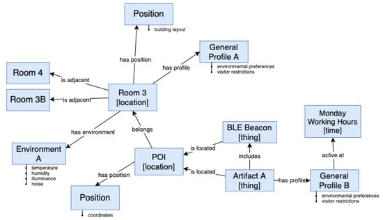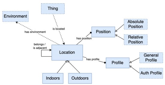 A location can be either indoors or outdoors. Although other inheritance approaches are valid for the definition of the location object, such as building, floor, corridor, and room scheme presented in SeCoMan ontology [], this work argues that conceptually, there is no need to integrate such differences in the location class. A location may belong to other locations, thus modeling the inheritance functionality. Apart from the self-referential relation of belonging, a location may also be adjacent to other locations, modeling spatial proximity. A thing can be located to a location which may be determined with high accuracy (e.g., a room, or an exact geolocated point), or with lower accuracy (e.g., a building, or a district), depending on the availability of sensory data and necessity. Multiple things may be located in the same locations, adjacent locations or locations of the same hierarchy (e.g., building), allowing inferences on proximity and interaction.
