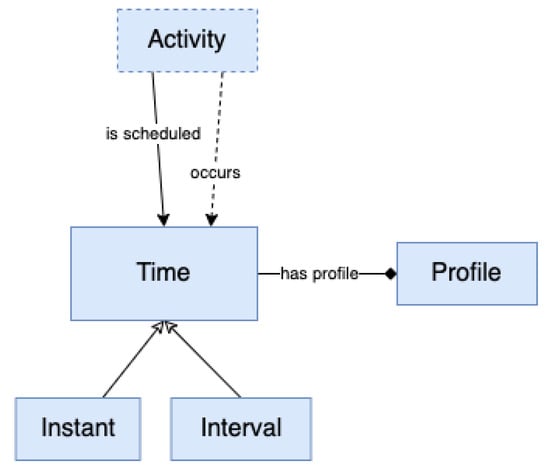 Furthermore, a time object may be instant, an exact timestamp without duration useful to capture instantaneous events such as a door ringing, or interval, a timeframe with duration, usually with a conceptual meaning, e.g., Monday work hours. This hierarchy is influenced by the OWL time ontology (available online: https://www.w3.org/TR/owl-time/ (accessed on 10 June 2021)). A time object may also have multiple profiles, which may indicate requirements or restrictions. For example, the time object “S3-MD23 Exams” may have a profile that requires a flight mode for all participants’ mobile phones, independent of the thing, activity and location involved.