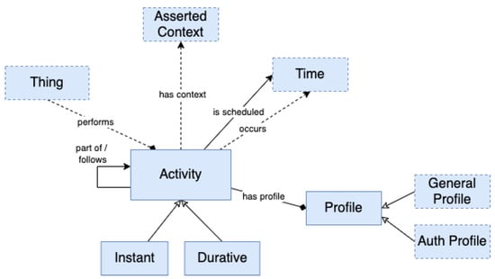 This class illustrated in Figure 5, aims to represent a wide range of cases, from typical human activities, to events triggered by human decisions or device actuation. Furthermore, it models not only observations of occurring activities, but also tentative activities. In order to model this distinction, an activity is related to the time class in different ways. It may occur in a specific timeframe, or is connected to time through the is scheduled relation. An activity has similar profiling classes with location: general profile and authorization profile to model privileges of things in respect to the activity, e.g., users permitted to turn on/off a device.