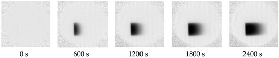 Figure 11 shows the development of the sample annealed in a nitrogen/steam atmosphere at 900 °C with a total gas flow rate of 24 L/h. A neutron radiography video of this reaction is available online as