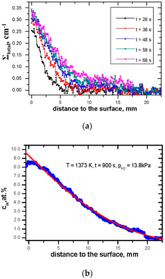 (a) Dependence of the total neutron cross section on the distance to the surface where the hydrogen penetrates at 1200 °C for annealing times between 28 and 68 s and (b) fit of the measured diffusion hydrogen distribution after 15 min annealing at 1100 °C with Equation (1).