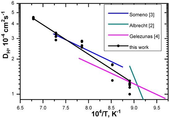 Arrhenius plots of the temperature dependence of the determined diffusivity and temperature correlations given in the literature.