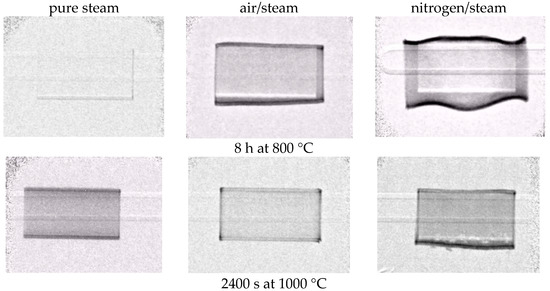 Comparison of neutron radiographs taken after 8 h reaction at 800 °C and 40 min at 1000 °C in pure steam, air/steam, and nitrogen/steam mixtures (flow rates of 2 g/h H2O and 10 L/h nitrogen or oxygen flux, respectively).