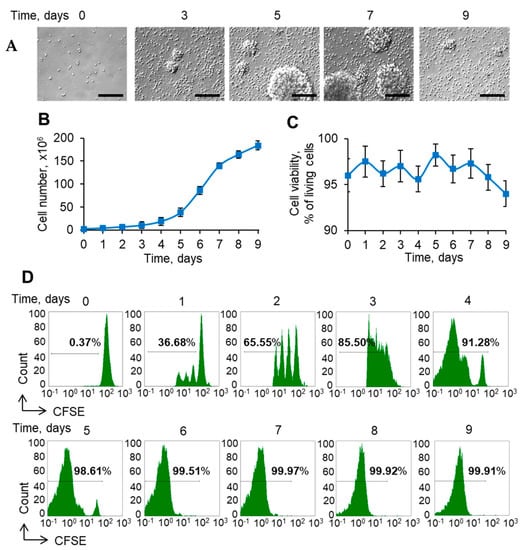 We studied the proliferative activity of the initial CD4+ T cells during cultivation in the presence of stimulating additives. Figure 1A shows that cells proliferate as aggregates or clusters at days 3 to 7. Cell numbers increased throughout the entire cultivation period; however, the most intensive growth was observed between days 5 and 7 (Figure 1B). After starting the culture with 5 × 106 CD4+ T cells, the yield was 135–150 × 106 cells in 7 days. Cell viability measured by Trypan Blue was not lower than 95% during eight days of cultivation, and was slightly decreased at day 9 (Figure 1C).