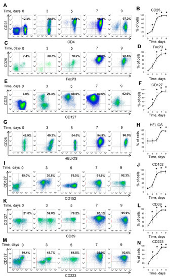 The expression of Treg markers reached a maximum ratio at day seven of ex vivo expansion. Initial CD4+ cells were cultured for 9 days to develop eTregs. Representative flow cytometry diagrams for cells labeled with the following antibodies: (A) CD25, (C) FoxP3, (E) CD127, (G) Helios, (I) CD152, (K) CD39, (M) CD223. (B,D,F,H,J,L,N) Mean expression of markers within the time of expansion. N = 5. * p ≤ 0.05 vs. initial cells at the 0-day time-point, measured by Bonferroni modification of Student’s t-test.