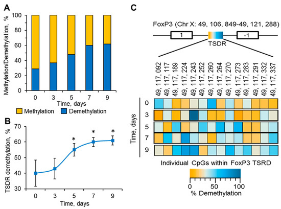 The level of TSDR demethylation increases during ex vivo expansion of Tregs. TSDR methylation analysis was performed during the time of cell expansion: (A) Levels of TSDR methylation and demethylation during Treg ex vivo maturation. (B) Mean level of TSDR methylation during Treg expansion. (C) Representative result of demethylation percentage of each CpG site in the TSDR color-coded according to the legend. Each column corresponds to a single CpG site. Absolute coordinates according to the GRCh37/hg19 human genome assembly are indicated. n = 5. * p ≤ 0.05 vs. initial cells at the 0-day time-point.
