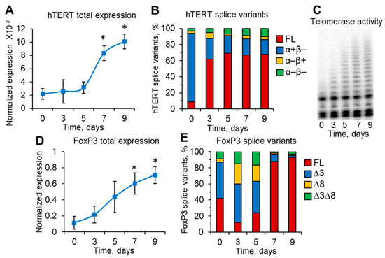 Upregulation of telomerase and FoxP3 is associated with the induction of alternative splicing of their mRNA: (A) Induction of total hTERT expression during the time of cell cultivation. (B) Changes in the proportion of hTERT splice variants. (C) Representative TRAP gel electrophoresis demonstrating elevated telomerase activity in Tregs upon maturation. (D) Gradual increase in FoxP3 gene expression during the time course of Treg maturation. (E) Changes in the proportion of FoxP3 splice variants. n = 4. * p ≤ 0.05 vs. initial cells at 0-day time-point. FL, full-length variant. α or β indicates corresponding splice variants (see main text). ∆ indicates the deletion of the relevant exon.