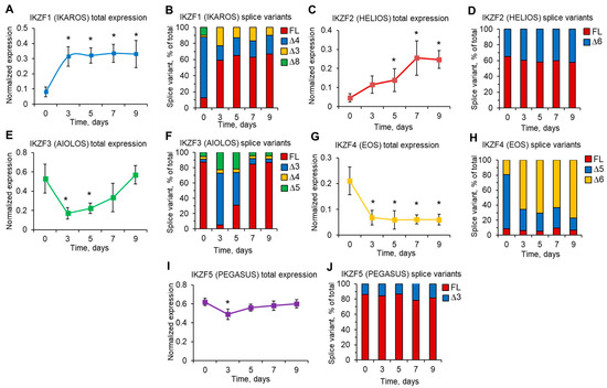 Expression profiles of IKAROS family zinc finger gene members and their splice variants during the time course of eTreg maturation ex vivo. The expression levels of total (A) IKZF1 (IKAROS), (C) IKZF2 (HELIOS), (E) IKZF3 (AIOLOS), (G) IKZF4 (EOS) and (I) IKZF5 (PEGASUS) in proliferating cells. (B,D,F,H,J) Proportions of corresponding splice variants. n = 4. * p ≤ 0.05 vs. initial cells at 0-day time-point. ∆ indicates the deletion of the relevant exon.