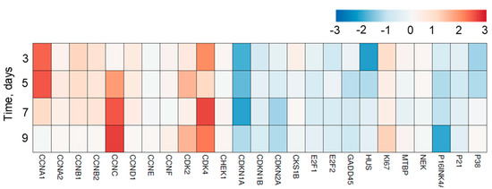 Since a seven-day expansion of Tregs is necessary for their ex vivo maturation, we aimed to determine the possible proteins involved in cell cycle regulation. The expression levels of 28 genes in responder cells were analyzed using the Human Cell Cycle RT2 Profiler PCR Array. The expression levels of the investigated genes were measured at the time of cultivation against the expression of those in freshly isolated CD4+ T cells (Figure 6). Significant changes in expression levels were found in cyclin genes that promote transition through S and G2/M phases. CCNA1, CCNA2, CCNB1, CCNB2 and CCND1 were upregulated within the first 7 days, whereas G1 phase-associated CCNC appeared to be upregulated within 5–9 days of cultivation. The expression of CCNE, whose activity is required for cell cycle G1/S transition, and the F-box family protein CCNF, remained unchanged [52]. We found that the expression of two cyclin-dependent kinases (CDKs), CDK2 and CDK4, was upregulated in responder cells, and the inhibitors of CDK2 and CDK4, namely, CDKN1A, CDKN1B and CDKN2A, were subsequently reduced. The expression of the CDK/cyclin inhibitor proteins P16INK4A and P21 was downregulated as expected, since it was previously shown in proliferating lymphocytes [53]. Cell proliferation is associated with the inhibition of P53 and RB tumor suppressor pathways [54]. We found that P53 and RB genes were expectedly downregulated during the entire time of cultivation. Activation of p38 can induce p21-dependent cell cycle arrest [55]. Despite reduced P21 and P38 activator GADD45, the expression of P38 was downregulated only at the 3–5-day time points. Along with the reduced RB gene, we found the downregulation of RB transcription factors E2F1 and E2F2. A component of the cell cycle checkpoint complex that causes cell cycle arrest in response to bulky DNA lesions and DNA replication blockage of HUS1 [56] was also downregulated in proliferating cells. The expression of a nuclear protein associated with cellular proliferation of KI67 [57] was significantly upregulated. The expression of the serine/threonine-protein kinase genes NEK and CHEK1 [58,59], which are involved in mitotic regulation, and the MTBP protein, which regulates progression through the cell cycle, remained unchanged. Our results indicate that the maturation of Tregs during 9 days of ex vivo cultivation is associated with the modulation of cell cycle regulatory gene expression. Our results indicate that the expression profile of cell cycle-regulating genes was not significantly changed between days 7 and 9 of maturation.